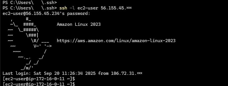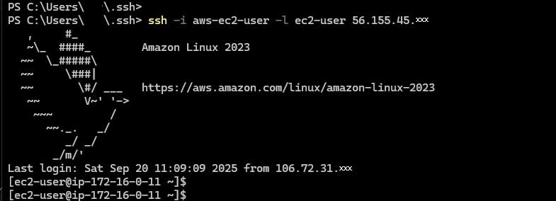 ssh -i aws-ec2-user -l ec2-user 56.155.45.xxx | SSHコマンドでログインを確認いたします。 |